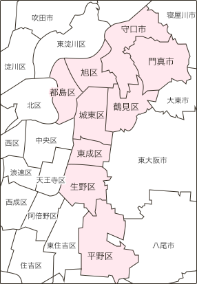 平野区、東成区、旭区、門真市、守口市